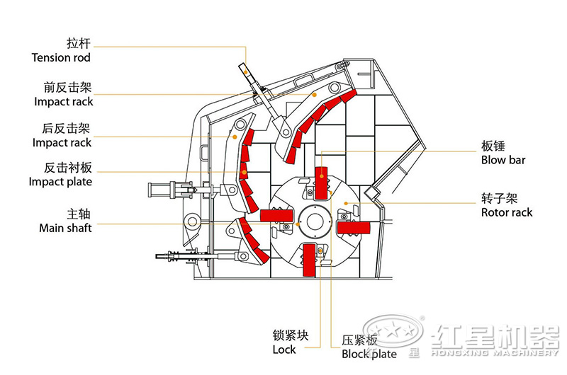 破碎的力來自兩方面,一方面是物料間的互相碰擊產生的作用力。另一方面,物料受到板錘的打擊、與反擊板的沖擊產生的力,這些力共同作用物料,使物料不斷產生裂縫,松散而致粉碎。當物料粒度小于反擊板與板錘之間的縫隙時,就被卸出。調整反擊架與轉子之間的間隙可達到改變物料出料粒度和物料形狀的目的。