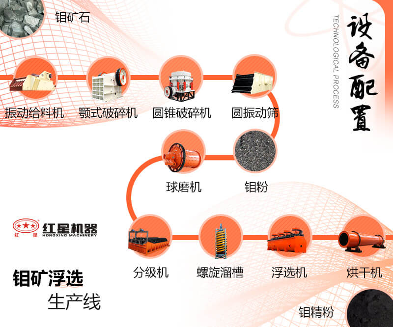 開(kāi)采而來(lái)的天然鉬礦首先要經(jīng)過(guò)鄂式破碎機(jī)的粗碎,進(jìn)行初步的破碎,隨后將符合粒度要求的鉬礦物料經(jīng)圓錐破碎機(jī)進(jìn)行再次的細(xì)碎,合格的物料經(jīng)提升機(jī)送至料倉(cāng)等待研磨。由給料裝置將物料送入球磨機(jī)進(jìn)行研磨,隨后將研磨后的鉬礦細(xì)料送入螺旋分級(jí)機(jī)進(jìn)行洗凈和分級(jí),隨后經(jīng)由攪拌桶送至浮選機(jī)進(jìn)行浮選作業(yè),浮選作業(yè)主要將所需礦物與其他礦物分離開(kāi),最后通過(guò)高產(chǎn)濃縮機(jī)將礦物中的水分去除,就得到了生產(chǎn)所需的鉬礦原料。